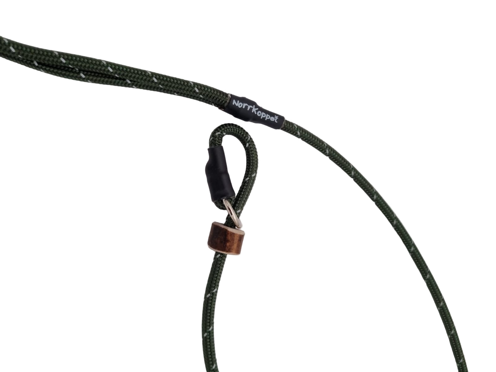 Retrieverkoppel i mörkgrön Ø 6 mm lina med reflex. Försett med ett reglerbart hornstopp som gör det enkelt att anpassa passformen efter din hund.